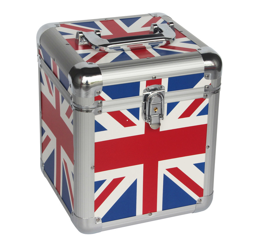Das 7" Rekordfälle Verbands-Jack Flag Aluminums CD/DVE für Aufzeichnungen Langspielplatte 50pcs, Großbritannien-Flaggen-Aluminiumkästen machte von 3mm Stärke MDF und von der ABS panel.2mm EVA nach innen, um Ihre Produkte zu schützen, die Zusammenstoß als Transport vermeiden.